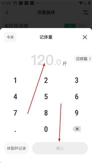 3、在彈窗中輸入今日體重數(shù)值,確認后點擊確認,完成體重記錄。