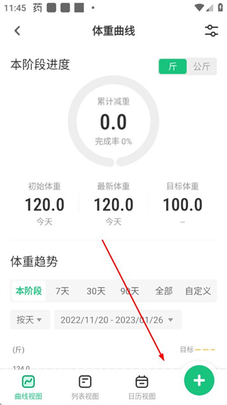 2、在體重曲線頁面點擊底部+,打開記體重輸入彈窗。