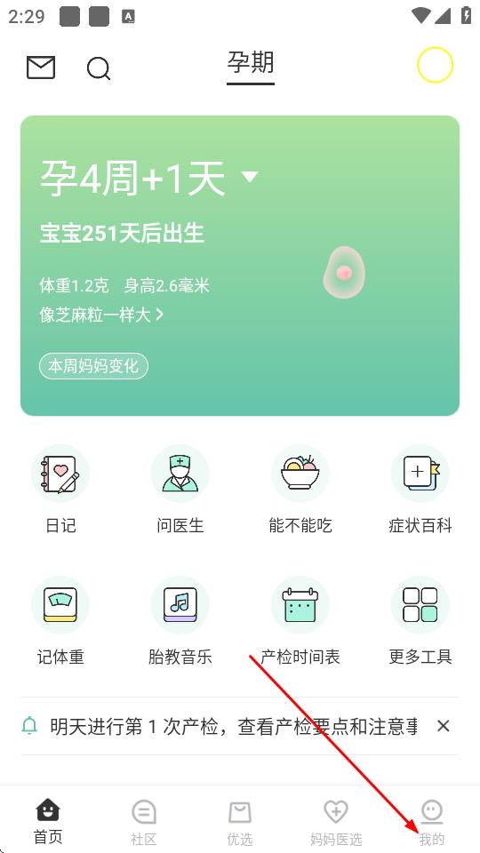 1、打開孕育提醒APP,點(diǎn)擊底部導(dǎo)航欄最右側(cè)的我的選項(xiàng)。