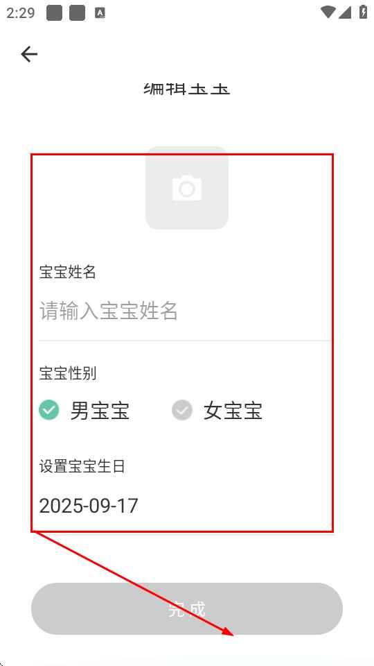5、進(jìn)入編輯寶寶頁面,填寫寶寶信息,點(diǎn)擊完成按鈕,即可成功添加孩子。