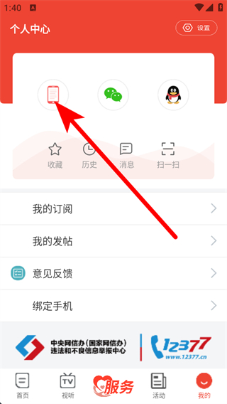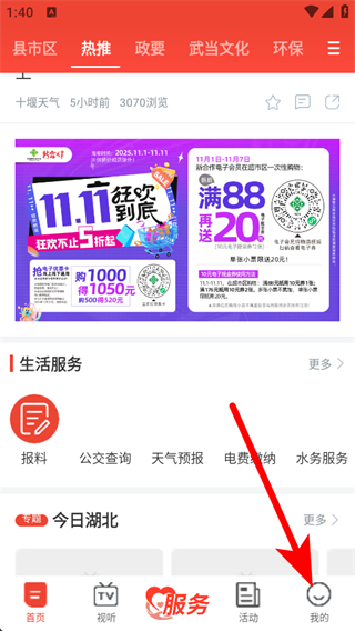 1、在十堰廣電app首頁(yè),點(diǎn)擊右下角我的選項(xiàng),進(jìn)入個(gè)人中心頁(yè)面。
