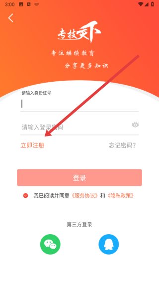1、在專技天下登錄頁(yè)面中,若沒有賬號(hào)可以點(diǎn)擊下方立即注冊(cè)按鈕,進(jìn)行注冊(cè)。