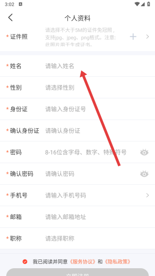 4、在進(jìn)入到個(gè)人資料頁(yè)面,點(diǎn)擊輸入框依次填寫對(duì)應(yīng)的信息后,即可完成注冊(cè)操作。