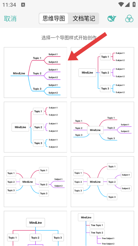 1、在MindLine主界面,點(diǎn)擊頂部的+按鈕,進(jìn)入導(dǎo)圖樣式選擇頁(yè)面。