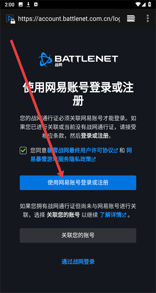 2、在該頁(yè)面點(diǎn)擊“使用網(wǎng)易賬號(hào)登錄或注冊(cè)”,進(jìn)入網(wǎng)易游戲賬號(hào)登錄界面。
