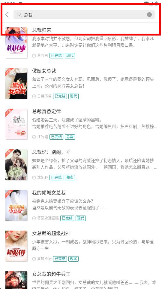 3、在彈出的搜索框中輸入想要查找的書籍關(guān)鍵詞如總裁,輸入完成后即可顯示相關(guān)書籍列表,點(diǎn)擊對應(yīng)書籍就能查看閱讀。