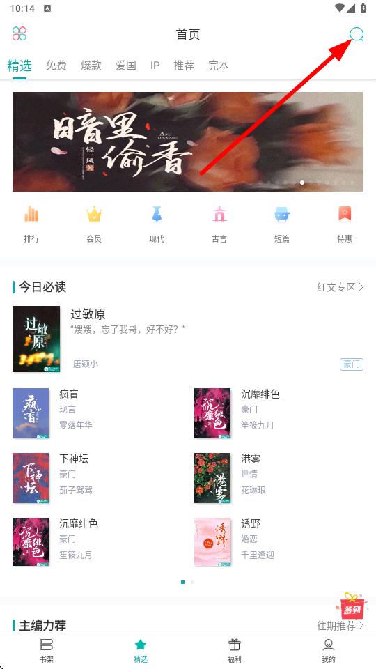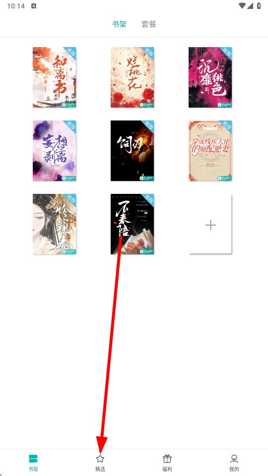 1、打開若初文學(xué)軟件,點(diǎn)擊底部導(dǎo)航欄中精選選項進(jìn)入首頁。