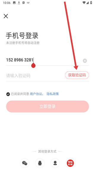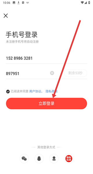 4、輸入收到的短信驗(yàn)證碼,點(diǎn)擊“立即登錄”按鈕,完成賬號(hào)登錄。