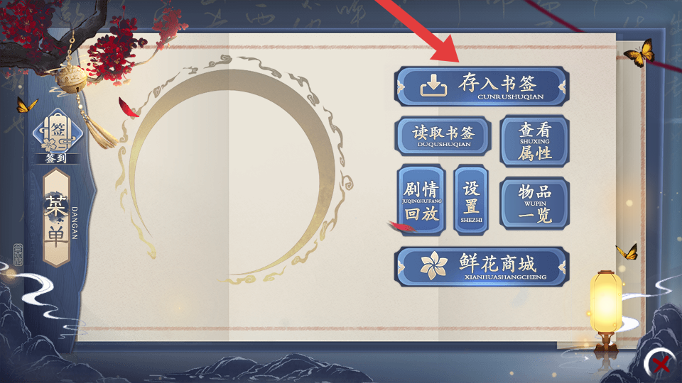 2、在游戲菜單的界面中,需要點(diǎn)擊存入書簽的按鈕,進(jìn)入書簽存儲(chǔ)的界面。