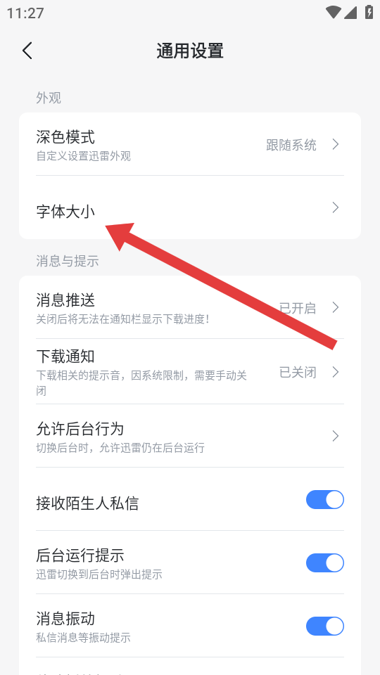 2、在個(gè)人賬號(hào)通用設(shè)置的頁(yè)面中,需要點(diǎn)擊字體大小的選項(xiàng),跳轉(zhuǎn)至字體大小設(shè)置頁(yè)面。
