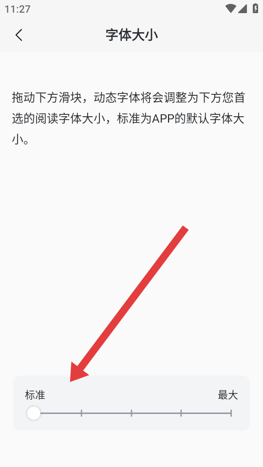 3、在字體大小的頁(yè)面,拖動(dòng)底部滑塊從標(biāo)準(zhǔn)到最大的區(qū)間,即可調(diào)整APP內(nèi)顯示的字體大小。