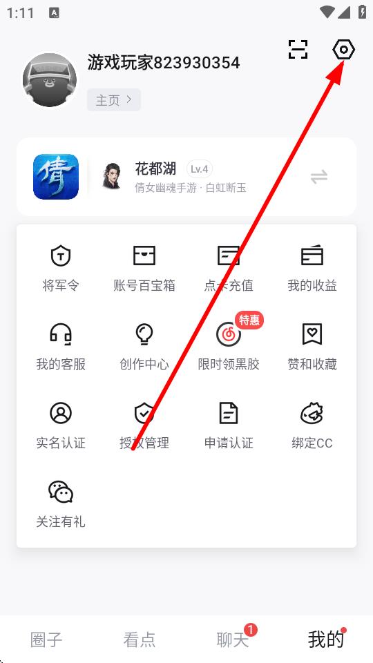 2、在個(gè)人中心頁面右上角點(diǎn)擊設(shè)置圖標(biāo),進(jìn)入設(shè)置界面。