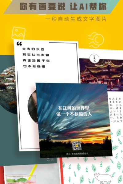 圖曰,運用人工智能對圖像的精準識別,一鍵匹配百萬名言金句,讓圖片加字,日簽,海報唾手可得。古代詩詞、名人語錄、文學經(jīng)典、影視金句、中外歌詞包羅萬象。還有文案達人和你自己的原創(chuàng)語錄。