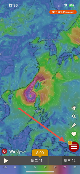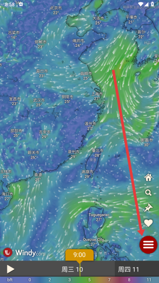 1、打開Windy app,點(diǎn)擊右下角紅色菜單按鈕,展開功能菜單。