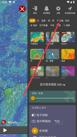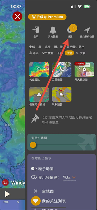 1、進(jìn)入到windy應(yīng)用中后,可以點(diǎn)擊右側(cè)圖標(biāo)按鈕展開側(cè)邊欄查看更多功能。