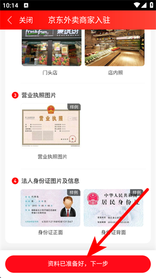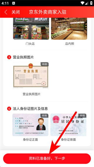 2、進入京東外賣商家入駐流程,點擊資料已準備好,下一步。