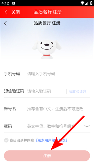 3、選擇賬戶注冊的選項,將進入品質餐廳注冊的頁面。