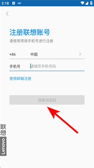 3、在注冊聯(lián)想賬號頁面,填寫常用手機號,點擊獲取動態(tài)碼。