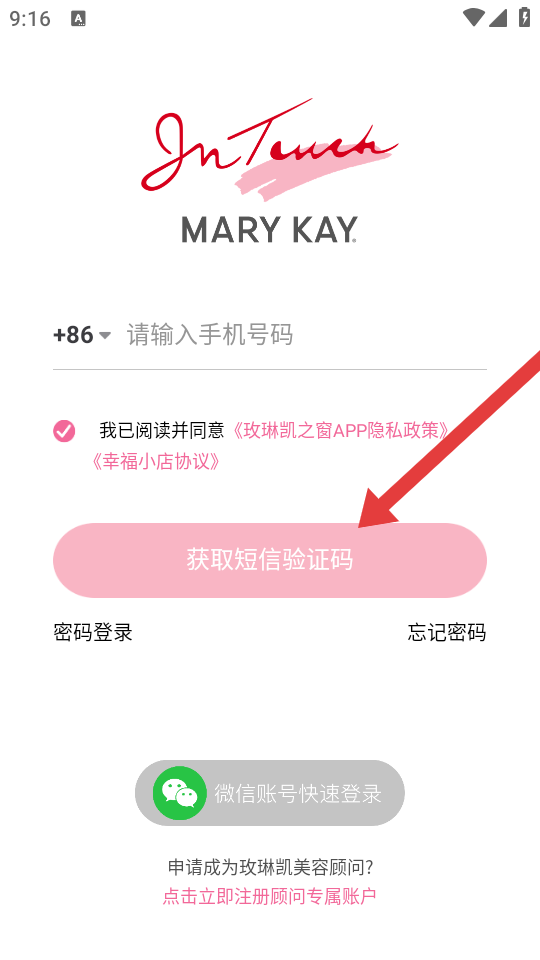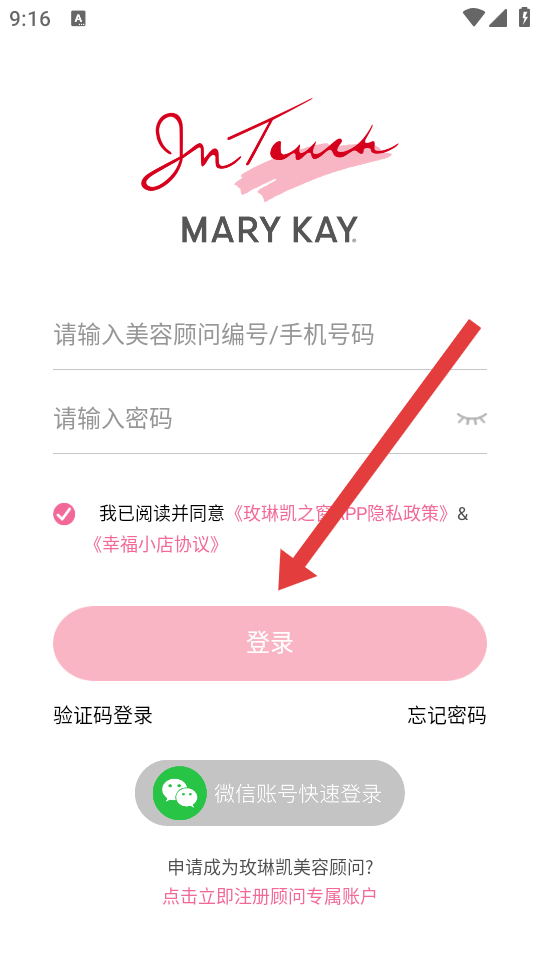 1、在玫琳凱之窗APP登錄頁面,輸入美容顧問編號/手機(jī)號碼及密碼,勾選協(xié)議后點(diǎn)擊登錄按鈕。