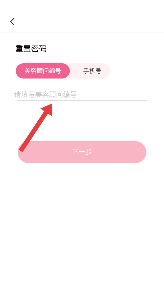 3、進(jìn)入重置密碼的頁面,選擇美容顧問的編號標(biāo)簽,需要在對應(yīng)輸入框填寫美容顧問編號。