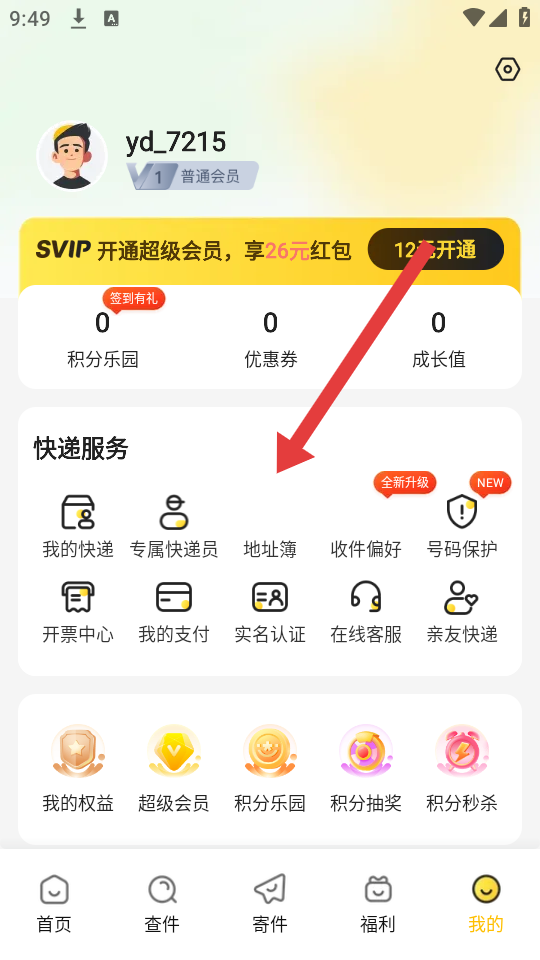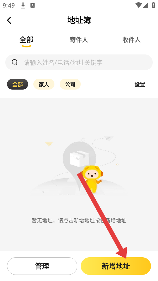 1、打開韻達快遞APP,進入我的頁面,找到并點擊地址簿的選項,進入地址管理的界面。