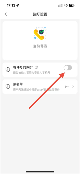 4、在偏好設(shè)置頁面,點擊寄件號碼保護右側(cè)的開關(guān)按鈕,開啟該功能即可。