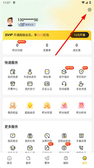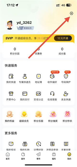 1、打開韻達快遞APP后,在我的界面找到右上角設(shè)置選項并點擊。