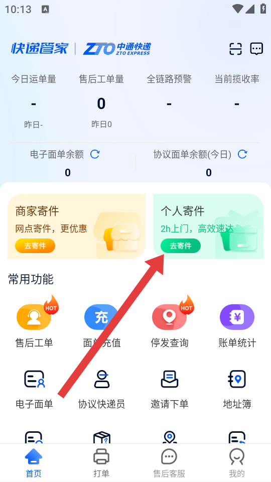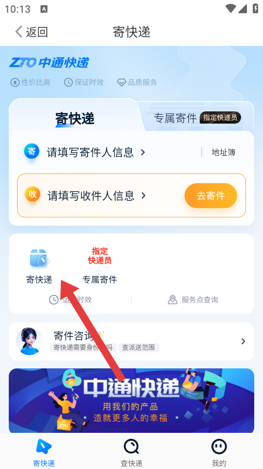 1、打開(kāi)中通快遞APP首頁(yè),點(diǎn)擊個(gè)人寄件模塊中的去寄件按鈕,進(jìn)入寄件操作的頁(yè)面。