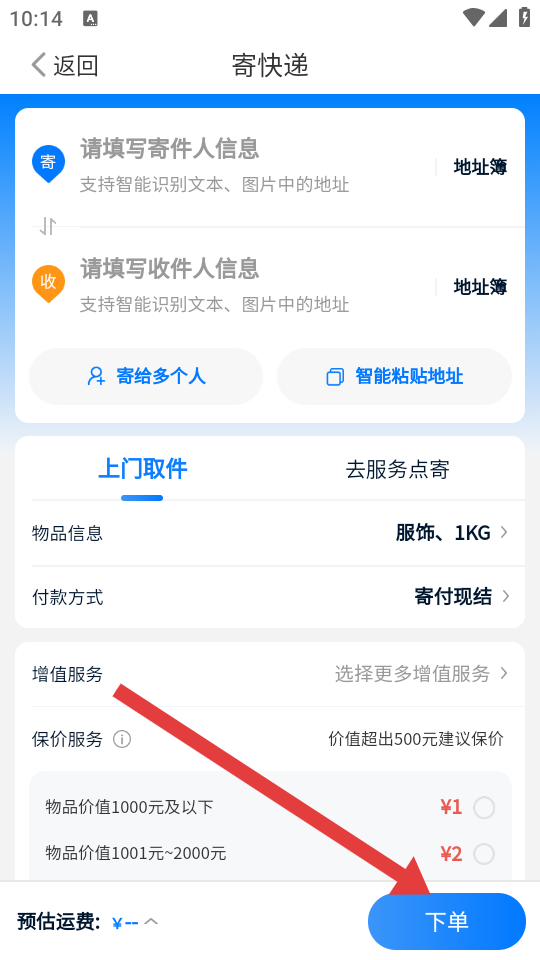 3、填寫(xiě)寄件人、收件人信息,設(shè)置物品信息、付款方式等,確認(rèn)無(wú)誤后點(diǎn)擊底部下單按鈕,完成上門(mén)取件預(yù)約。