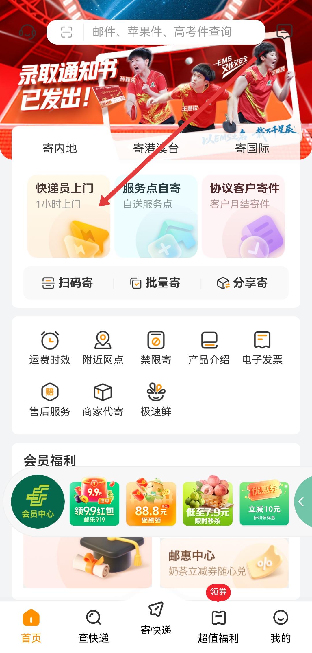 1、打開郵政EMSAPP首頁,可以選擇點(diǎn)擊快遞員上門模塊或?qū)?yīng)寄件入口,進(jìn)入寄件操作頁面。