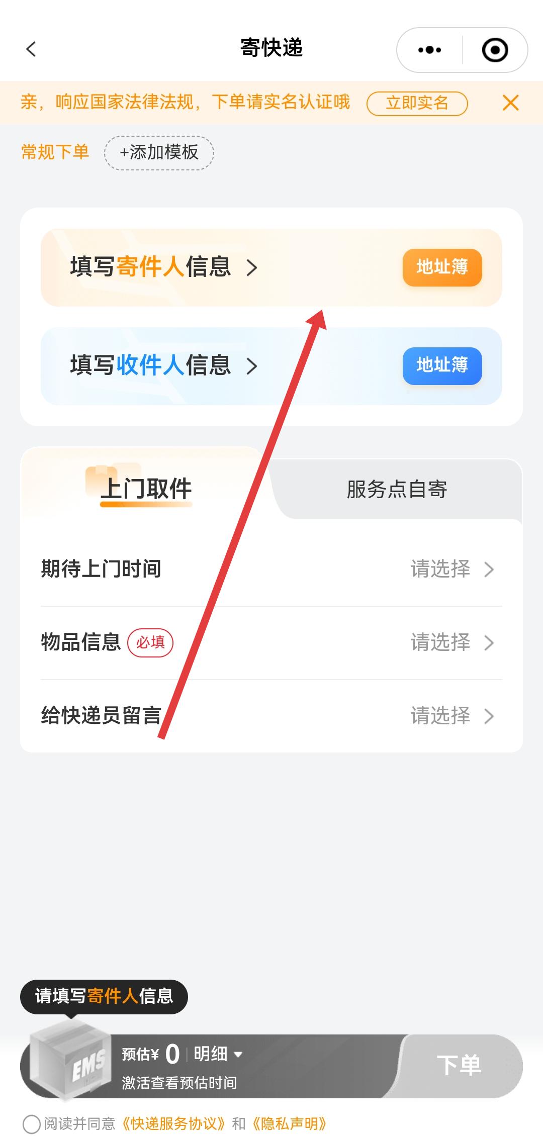 2、在寄快遞頁面,依次填寫寄件人信息和收件人信息,可通過地址簿快速選擇歷史地址。