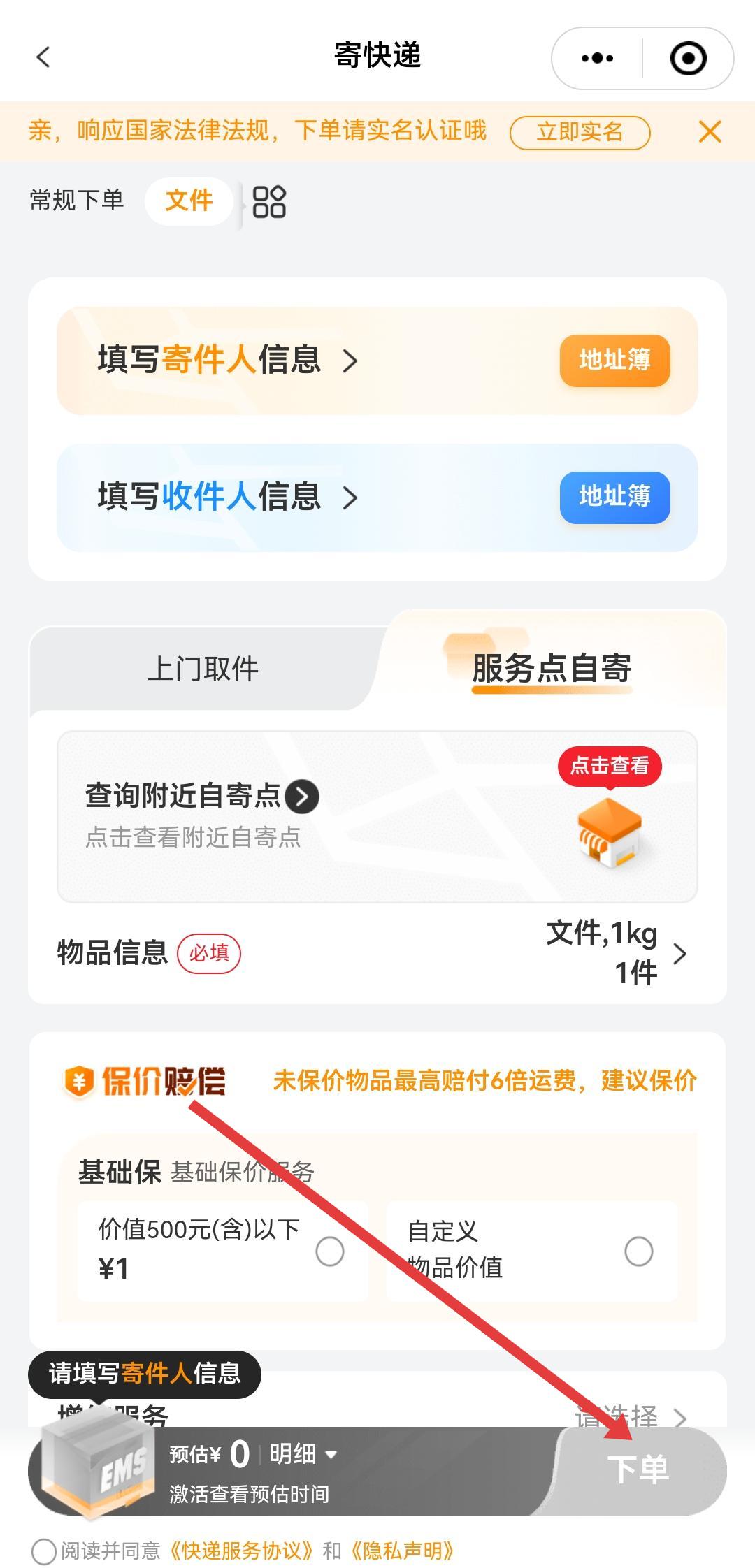 3、選擇寄件方式如上門取件/服務(wù)點(diǎn)自寄,這里我們選擇的是服務(wù)點(diǎn)自寄,勾選協(xié)議后點(diǎn)擊底部下單,完成寄件預(yù)約。