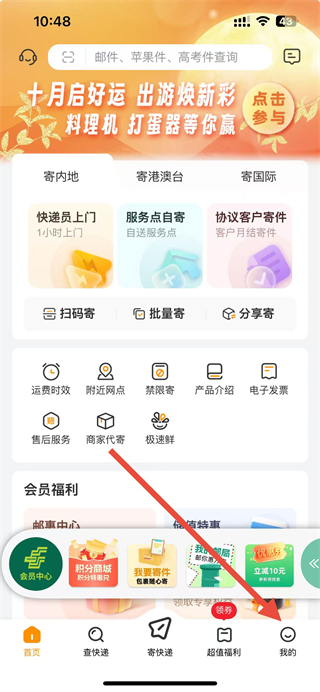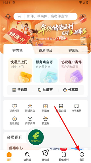 1、打開郵政EMS軟件,在首頁點(diǎn)擊右下角我的選項(xiàng)。