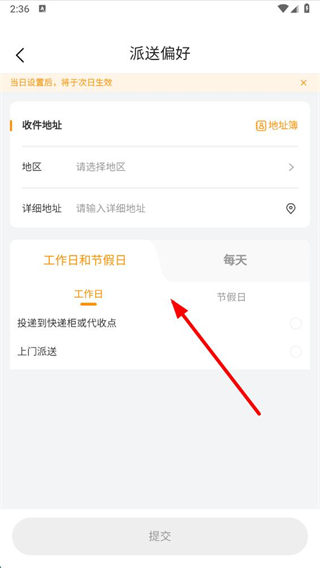 4、在界面選擇地址、派送時間工作日或節(jié)假日等,點(diǎn)擊提交即可完成郵政EMS派送時間設(shè)置。