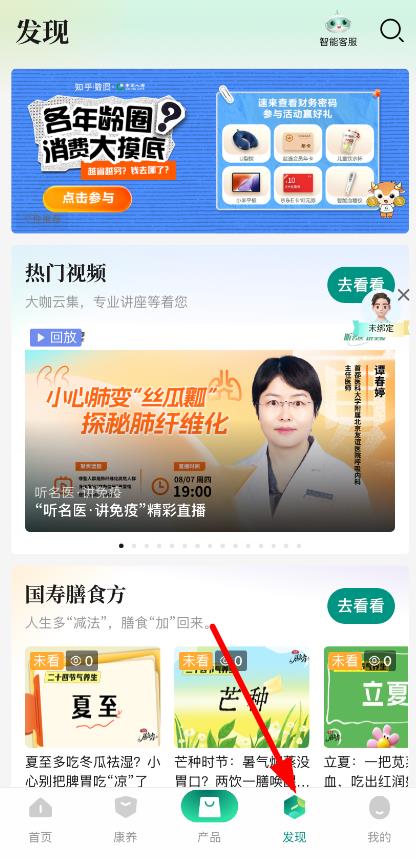 1、打開中國國壽e店APP,進(jìn)入底部導(dǎo)航欄的發(fā)現(xiàn)頁面,在這里可以看到各類視頻內(nèi)容入口。