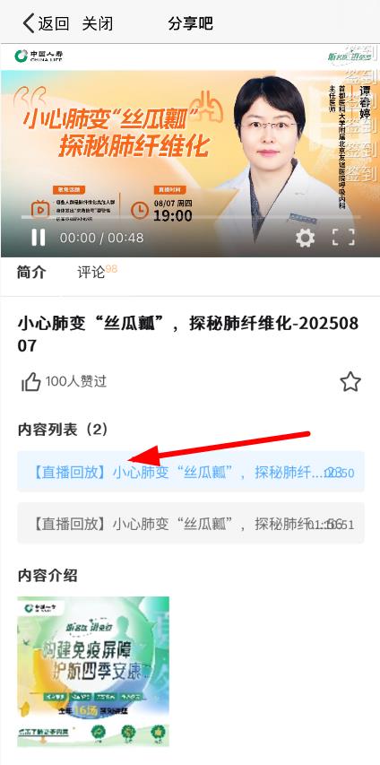 3、進(jìn)入視頻詳情頁面后,在內(nèi)容列表中選擇想要觀看的視頻如直播回放視頻,點(diǎn)擊視頻標(biāo)題即可開始播放視頻。