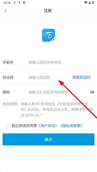 3、在界面中依次輸入手機(jī)號(hào)、獲取并填寫驗(yàn)證碼,再設(shè)置密碼,勾選協(xié)議后點(diǎn)擊確定按鈕,即可完成注冊(cè)。