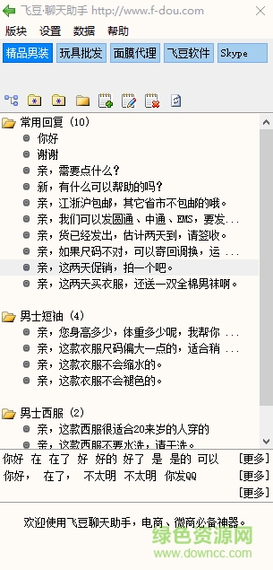 飛豆聊天助手是一款免費(fèi)微商聊天工具,支持qq、微信、阿里旺旺、京東、yy等多種聊天工具,幫助你快速回復(fù)客戶信息,更好的提供咨詢服務(wù),來(lái)綠色資源網(wǎng)試試吧!