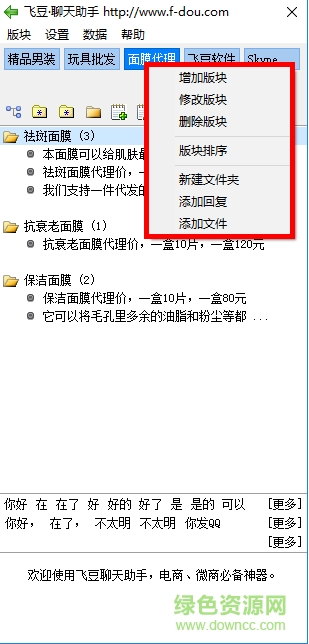 4.飛豆聊天助手分十個(gè)大版塊,每個(gè)版塊以文件夾方式進(jìn)行細(xì)分,例如你有多塊業(yè)務(wù),可在聊天助手里添加美妝、服飾、食品、嬰幼等等版塊,又可以對(duì)每個(gè)版塊以文件夾的形式細(xì)分,如售前報(bào)價(jià)、產(chǎn)品描述、售后咨詢等等經(jīng)常需要在聊天過(guò)程中用到的語(yǔ)句和內(nèi)容。