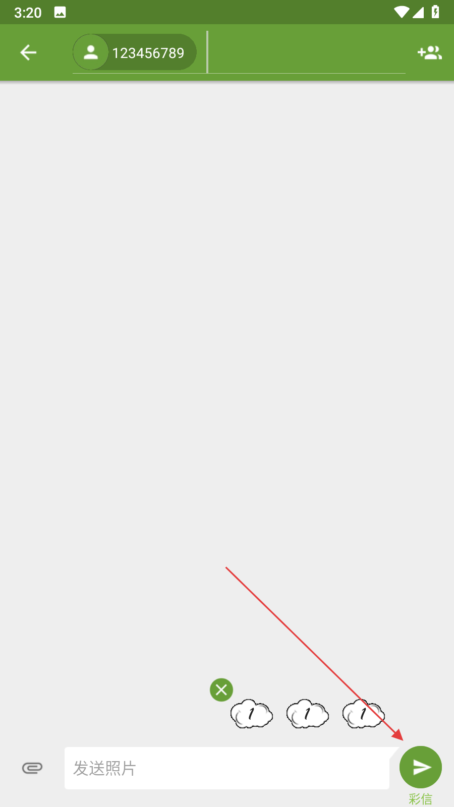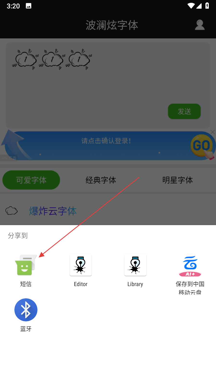 2、文字輸入完成后,點(diǎn)擊應(yīng)用界面中的發(fā)送按鈕,隨后會(huì)彈出分享選項(xiàng),在分享選項(xiàng)里找到并點(diǎn)擊短信圖標(biāo)。