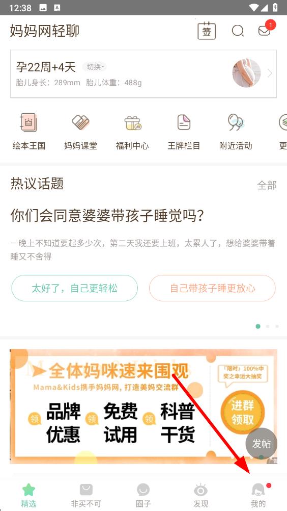 1、打開媽媽網(wǎng)輕聊app,點擊底部導航欄最右側標有我的的圖標,進入個人相關界面。