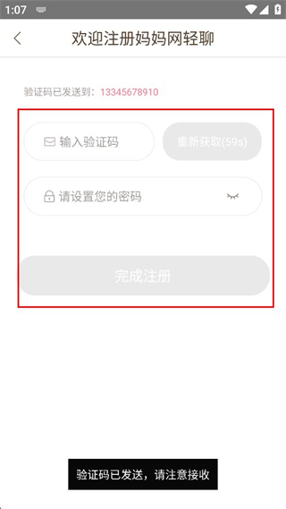 4、在對應輸入框填寫收到的驗證碼,設置登錄密碼,后續(xù)點擊完成注冊即可完成流程。