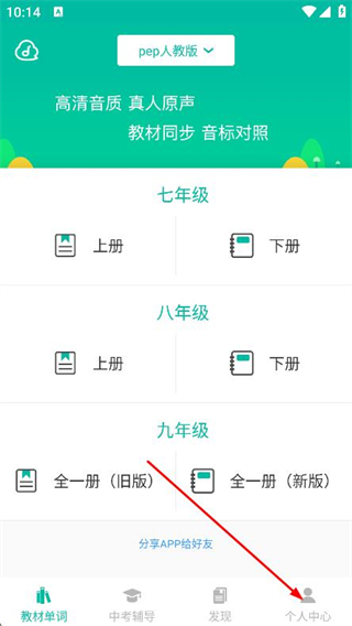 1、打開初中英語(yǔ)寶app,點(diǎn)擊導(dǎo)航欄的個(gè)人中心選項(xiàng)。