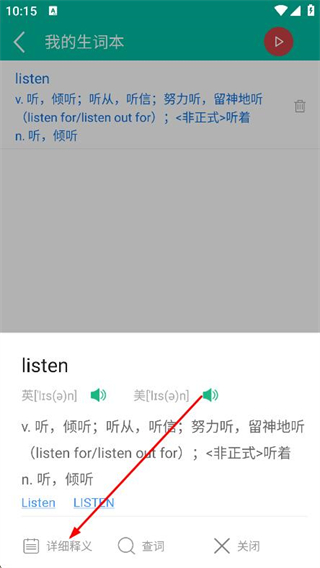4、在彈出的頁(yè)面中,點(diǎn)擊詳細(xì)釋義即可查看該生詞的詳細(xì)釋義。