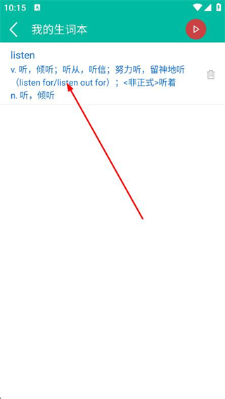 3、進(jìn)入我的生詞本頁(yè)面后,長(zhǎng)按需要查看詳細(xì)釋義的生詞。