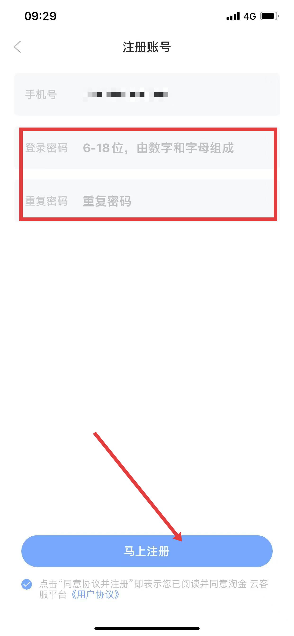 4、手機(jī)號碼自動輸入,設(shè)置登錄密碼,重復(fù)輸入密碼,勾選同意相關(guān)協(xié)議后,點(diǎn)擊馬上注冊,即可完成注冊。