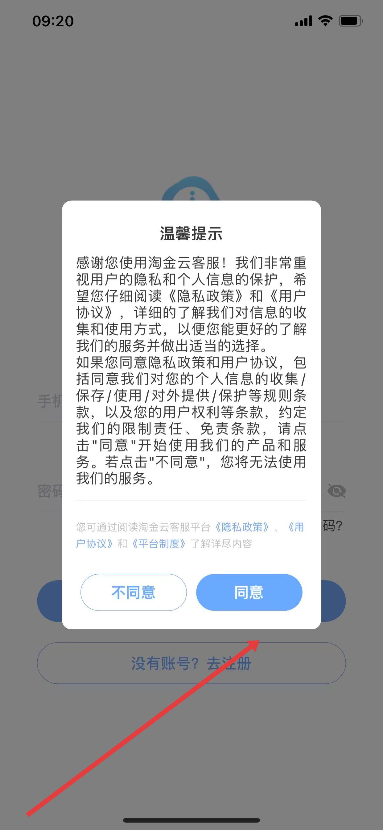1、打開淘金云客服APP,在彈出的溫馨提示窗口中,點(diǎn)同意,閱讀并同意隱私政策和用戶協(xié)議。