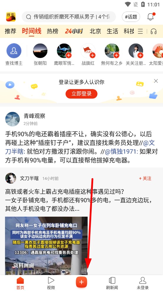 1、打開搜狐新聞APP,點(diǎn)擊底部導(dǎo)航欄中間的+圖標(biāo),進(jìn)入發(fā)布頁(yè)面。