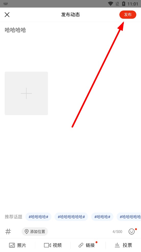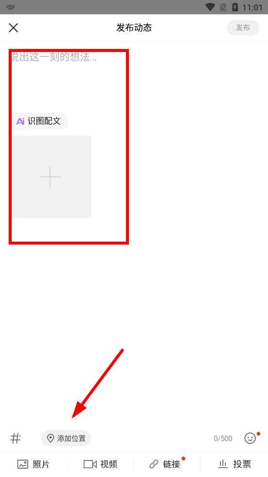 2、在發(fā)布動(dòng)態(tài)頁(yè)面,在文本框內(nèi)輸入你想要發(fā)布的文章內(nèi)容,添加照片,點(diǎn)擊添加位置附上發(fā)布內(nèi)容的位置信息。