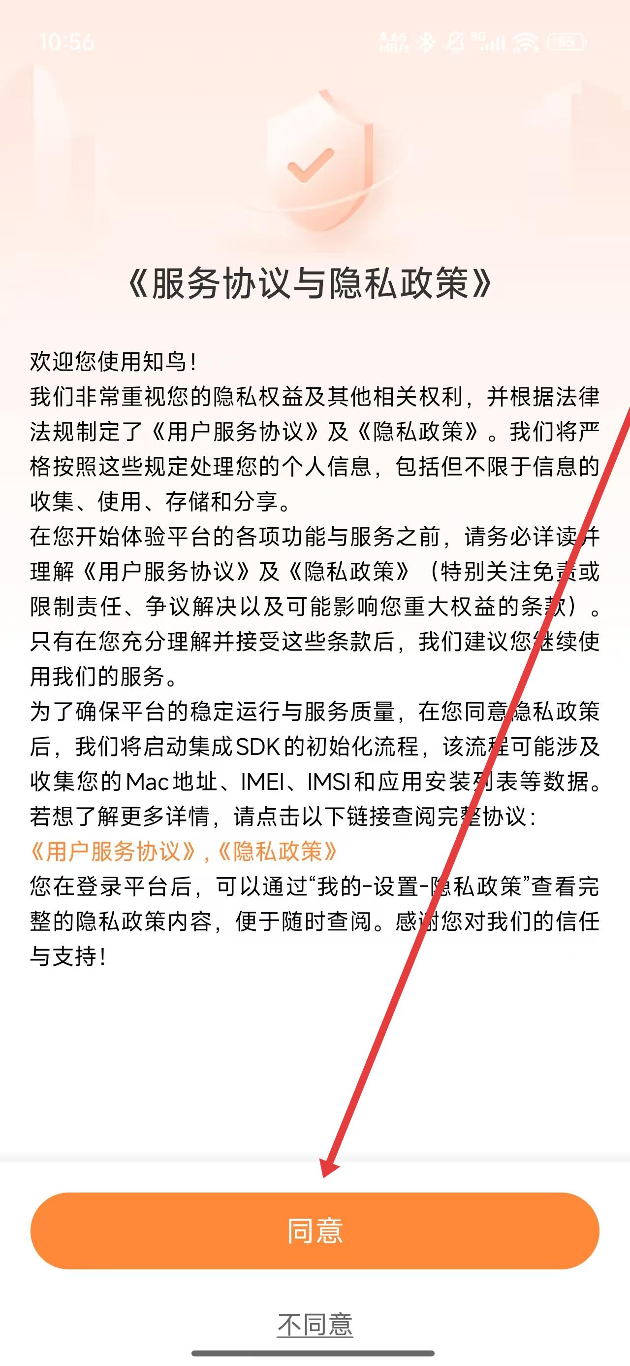 1、打開知鳥app后,點擊屏幕中的同意按鈕進入使用。